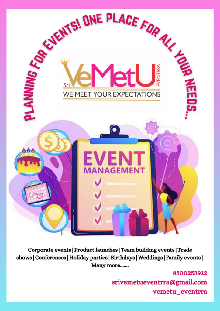 I’m Vishal Mettu, the founder of VeMetuU Eventrra, where we turn dream events into reality. With over five years of hands-on experience in event management, I started this company with a clear vision: to create high-quality, customized events that truly reflect our clients’ ideas and emotions. From weddings and corporate events to private celebrations, my team and I are committed to delivering seamless planning, creative execution, and unforgettable experiences. Every event we manage is built on trust, attention to detail, and a passion for excellence.